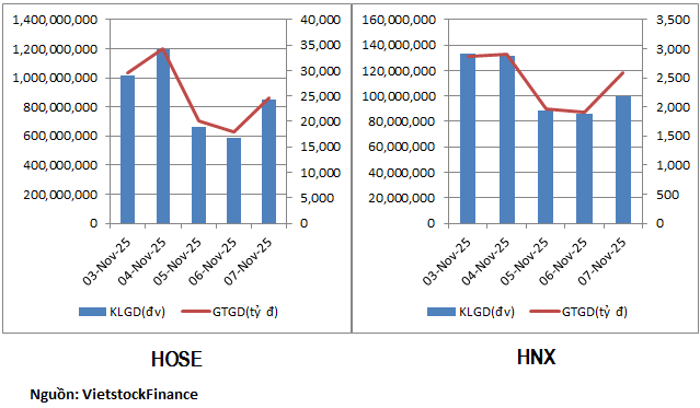 Dòng tiền diễn biến ngược chiều ở hai sàn. Trên HOSE, thanh khoản tiếp tục suy yếu, khối lượng giao dịch bình quân giảm hơn 3% còn 860 triệu đơn vị/phiên. Khối lượng giao dịch theo đó giảm hơn 8% còn 25.2 ngàn tỷ đồng/phiên.