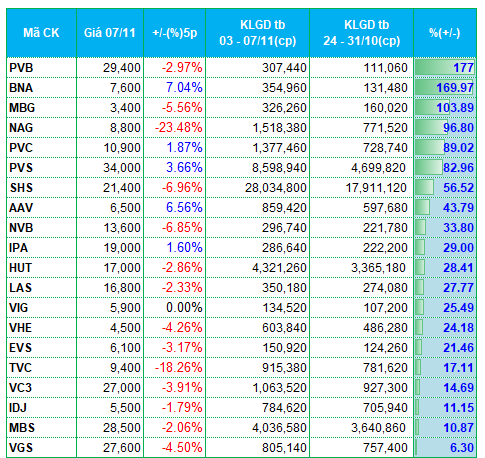 Top 20 mã có thanh khoản tăng/giảm cao nhất sàn HNX