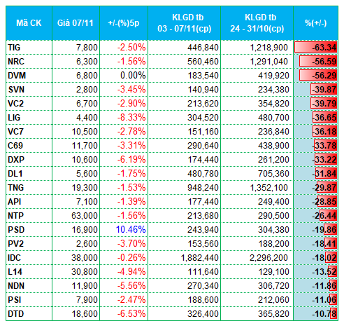 Ở nhóm chứng khoán, nhiều mã gia tăng mạnh thanh khoản như SHS với khối lượng giao dịch bình quân lên tới hơn 28 triệu cp/phiên, tăng 56% so với tuần trước. VIG, EVS, TVC, MBS cũng lọt top tăng mạnh thanh khoản. Tuy nhiên, cũng không ít cổ phiếu ở nhóm này chịu cảnh sụt giảm mạnh về khối lượng giao dịch. ORS giảm khối lượng giao dịch tới gần 65% so với tuần trước về còn gần 3 triệu đơn vị/phiên. TCX, DSE, PSI là các đại diện khác của nhóm có mặt trong top giảm mạnh thanh khoản ở hai sàn niêm yết.