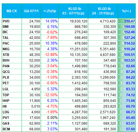 Nhóm dầu khí, xăng dầu cũng ghi nhận diễn biến tích cực về thanh khoản. PVD, PLX, GAS, PVC, PVS đồng loạt tăng thanh khoản trong tuần vừa qua.