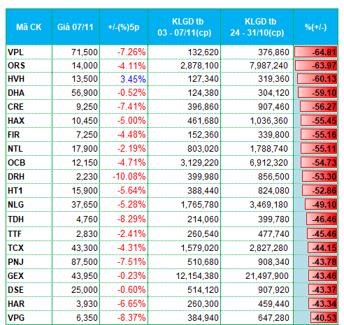 * Danh sách các mã tăng, giảm thanh khoản nhiều nhất xét đến khối lượng giao dịch bình quân trên 100,000 đơn vị/phiên.