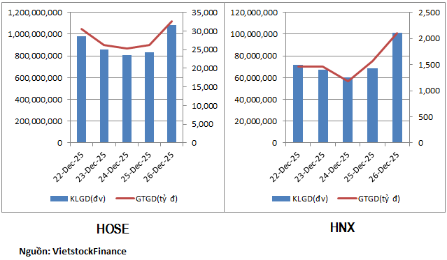 Về mặt thanh khoản, khối lượng giao dịch sàn HOSE tăng gần 18% lên mức 900 triệu đơn vị/phiên và giá trị giao dịch tăng hơn 26% lên 28.2 ngàn tỷ đồng. Ở sàn HNX, khối lượng giao dịch tăng 15% lên gần 74 triệu đơn vị/phiên. Giá trị giao dịch tăng 20%, đạt hơn 1.5 ngàn tỷ đồng.