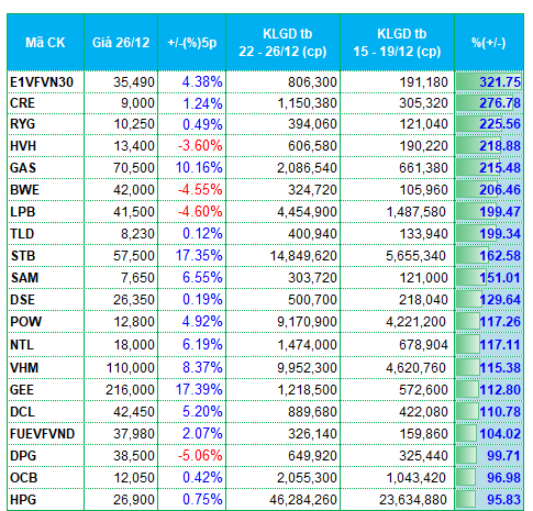 Dù kém sắc về cuối tuần với hai phiên giảm 25 – 26/12, nhìn tổng quan, thị trường chứng khoán vẫn có một tuần giao dịch (22 – 26/12) tích cực khi điểm số và thanh khoản đều được cải thiện. Cụ thể, VN-Index ghi nhận mức tăng 5%, đạt gần 1,730 điểm. HNX-Index tăng 0.2% lên 250.53 điểm.