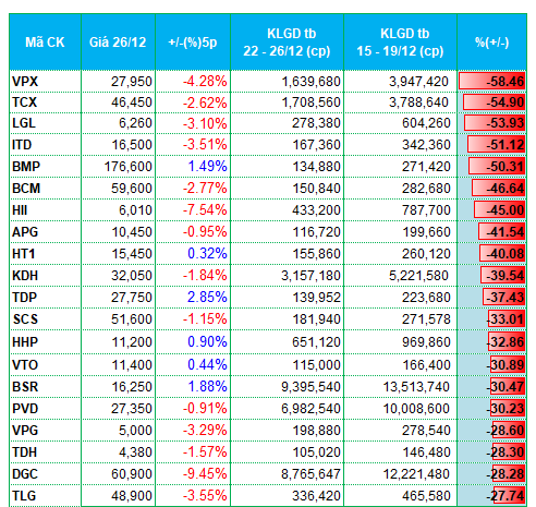 * Danh sách các mã tăng, giảm thanh khoản nhiều nhất xét đến khối lượng giao dịch bình quân trên 100,000 đơn vị/phiên.
