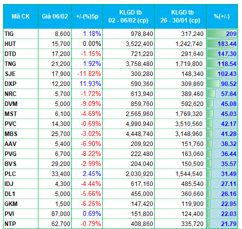 Điển hình như nhóm cổ phiếu bất động sản, SZC, TIG, DTD, NRC, AAV, IDJ… lọt nhóm tăng mạnh thanh khoản ở hai sàn niêm yết. Trong đó, SZC có khối lượng giao dịch tăng tới hơn 300% so với tuần trước, đạt gần 3.4 triệu đơn vị/phiên. TIG, DTD cũng ghi nhận khối lượng tăng bằng lần so với tuần trước.