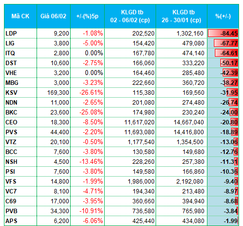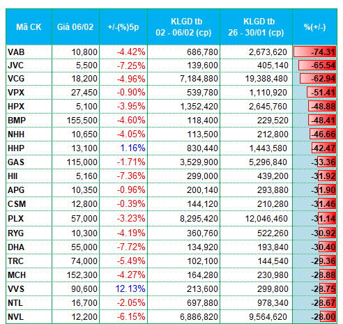 Ở chiều ngược lại, VCG, HPX, LIG, VC7, V69 cùng các mã vật liệu xây dựng như RYG, DHA, BCC… có mặt trong nhóm giảm mạnh thanh khoản so với tuần trước.