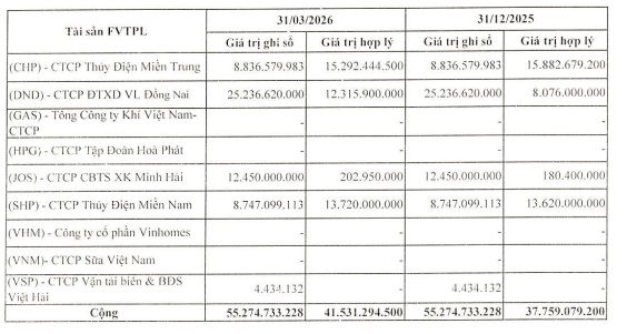 Danh mục đầu tư tiếp tục tập trung vào các cổ phiếu như DND, CHP, JOSSHP, với CHP là khoản hiếm hoi có lãi, trong khi phần lớn các khoản còn lại vẫn đang thấp hơn giá trị ghi sổ. Việc giá trị hợp lý cải thiện trong bối cảnh quy mô danh mục giữ nguyên cho thấy biến động lợi nhuận tự doanh chủ yếu đến từ việc đánh giá lại theo giá thị trường, thay vì từ hoạt động mua bán hay tái cơ cấu, đồng thời phản ánh phần lỗ chưa thực hiện vẫn còn tương đối lớn.