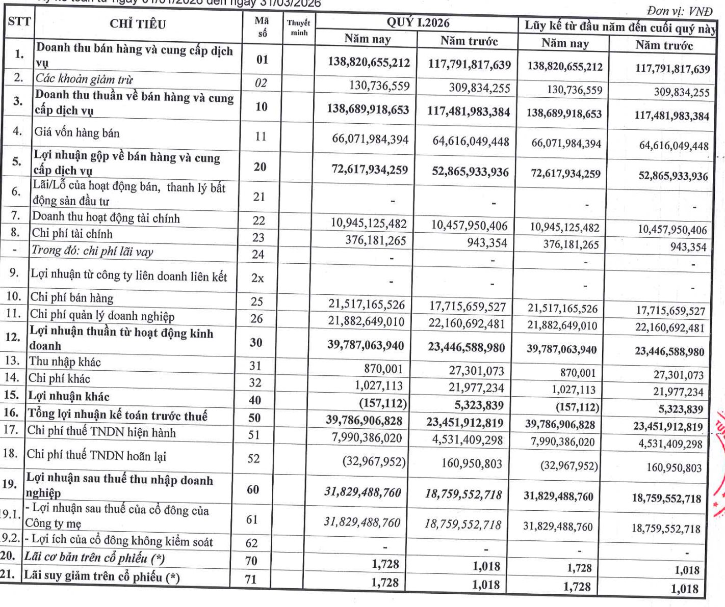 Biên lợi nhuận gộp được cải thiện từ 45% cùng kỳ lên 52% trong quý 1/2026.