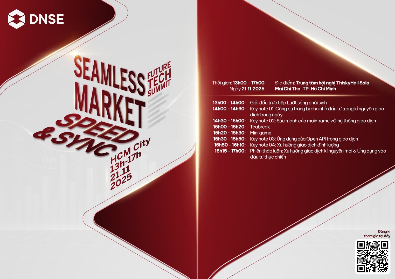 Ngày 21/11/2025 tại TP. Hồ Chí Minh, DNSE sẽ tổ chức DNSE Future Tech Summit, sự kiện chuyên sâu cập nhật xu hướng và các giải pháp giao dịch đột phá trong bối cảnh cơ chế cho phép bán chứng khoán chờ về, kéo dài thời gian giao dịch trong ngày dự kiến sớm được áp dụng.