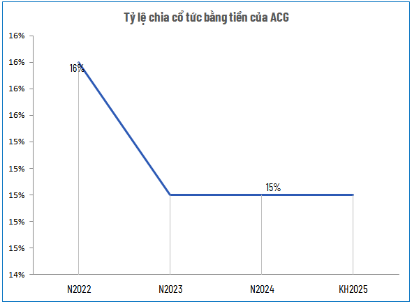 Trong 3 năm gần đây (2022-2024), ACG duy trì chia cổ tức tiền mặt đều đặn. Năm 2022, Doanh nghiệp ghi nhận lợi nhuận kỷ lục 616 tỷ đồng và chia cổ tức 16% – mức cao nhất trong 3 năm; 2 năm sau đó giữ ổn định ở mức 15% khi lợi nhuận duy trì quanh 400 tỷ đồng.