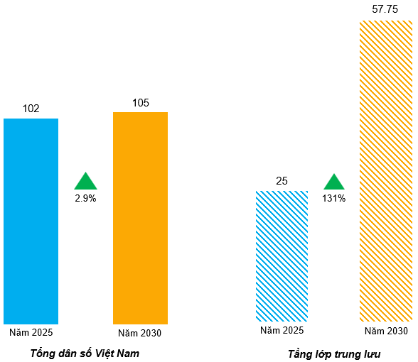 Theo báo cáo Minh bạch PwC Việt Nam, tầng lớp trung lưu tại Việt Nam dự báo chiếm hơn 55% dân số vào năm 2030. Tầng lớp trung lưu với mức thu nhập cao hơn trong cộng đồng ngày càng tăng sẽ có xu hướng tiêu dùng nhiều hơn, tạo ra một thị trường tiêu dùng nội địa khổng lồ, đặc biệt cho các ngành bán lẻ, bất động sản và dịch vụ.