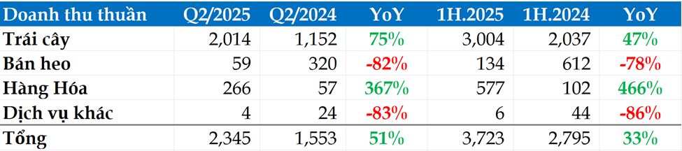 Từ năm 2024, HAG đã có sự thay đổi mạnh trong cấu trúc đóng góp của các mảng kinh doanh. Mảng trái cây từ 46,2% mở rộng lên lần lượt 72% tại năm 2024 và lên 82% 6 tháng đầu năm 2025 trong cơ cấu doanh thu toàn doanh nghiệp. Trong khi thu hẹp mạnh mảng Chăn nuôi heo (Giảm tái đàn) có biên lợi nhuận thấp hơn, trong bối cảnh giá theo thấp, dịch bệnh của 2023.