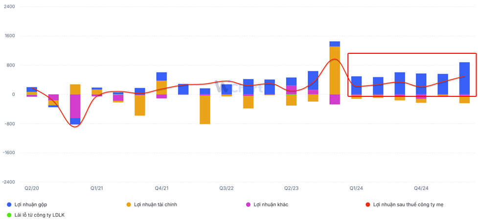 Xóa lỗ lũy kế bằng chính dòng tiền từ hoạt động kinh doanh cốt lõi. Tại Q2/2025, HAG ghi nhận doanh thu thuần đạt 2.327 Tỷ đồng, tăng +53% so với cùng kỳ Q2/2024, với đóng góp của mảng cây ăn trái tăng trưởng +75%, cùng với biên lợi nhuận gộp mảng này tăng lên 49% so với cùng kỳ ở mức 36%. Điều này đã giúp lợi nhuận sau thuế đạt 493 tỷ đồng, tăng trưởng 88% so với cùng kỳ, và chính thức xóa lỗ lũy kế (Tại Q1/2025: -82 Tỷ).