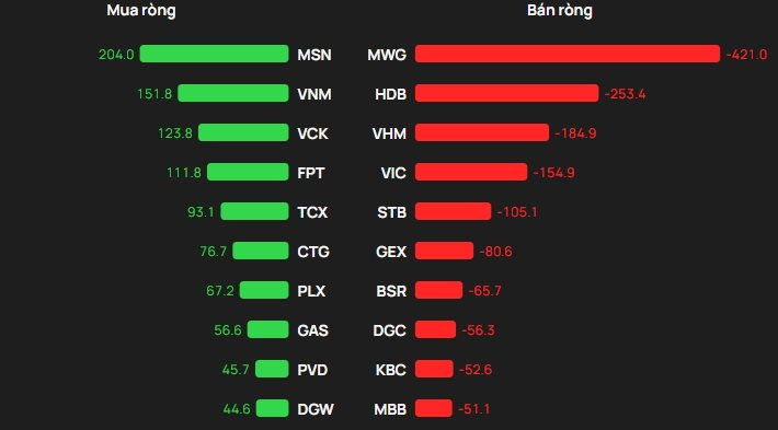 Ở chiều ngược lại, áp lực bán ròng trên HoSE tập trung mạnh nhất tại MWG với giá trị khoảng 421 tỷ, theo sau là HDB (-253 tỷ đồng). Các mã khác cũng bị “xả” trên trăm tỷ bao gồm: VHM (-185 tỷ đồng), VIC (-155 tỷ đồng) và STB (-105 tỷ đồng).
