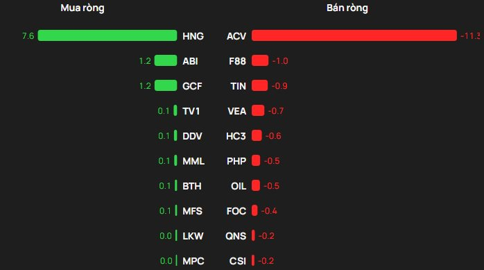 Ngược lại, cổ phiếu chịu áp lực bán ròng mạnh nhất trên UPCoM là ACV với giá trị khoảng 11 tỷ đồng. Xếp sau là F88 (-1 tỷ đồng), TIN (-0,9 tỷ đồng), VEA (-0,7 tỷ đồng) và HC3 (-0,6 tỷ đồng).