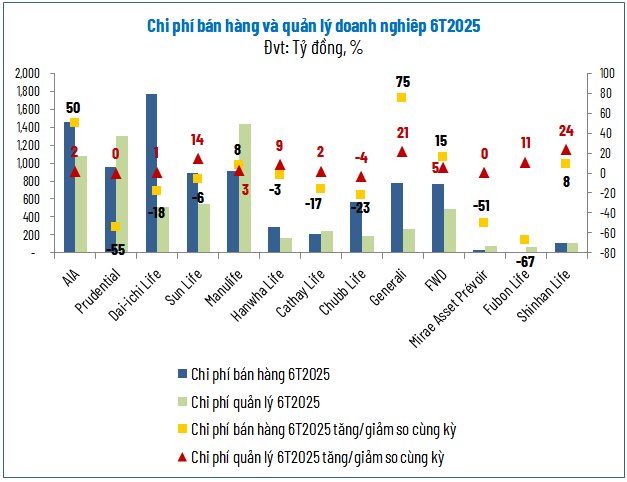 Sự sụt giảm lợi nhuận ở cả mảng kinh doanh bảo hiểm và hoạt động tài chính đã kéo lùi kết quả chung của toàn khối. Sau khi trừ chi phí bán hàng 8.7 ngàn tỷ đồng (giảm 9% so với cùng kỳ) và chi phí quản lý 6.4 ngàn tỷ đồng (tăng nhẹ 4%), tổng lợi nhuận trước thuế của 13 doanh nghiệp BHNT ngoại chỉ còn 3.3 ngàn tỷ đồng, tức giảm hơn một nửa so với cùng kỳ năm 2024.