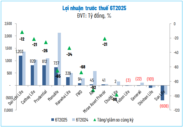 Các doanh nghiệp còn lại cũng không mấy khả quan. Chubb Life giảm lãi tới 98%, chỉ còn 2 tỷ đồng; AIA cũng giảm 92%, còn 45 tỷ đồng. Dù Dai-ichi Life, Cathay Life, Prudential và Manulife duy trì kết quả dương, mức giảm lợi nhuận 2 chữ số cho thấy sức ép cạnh tranh và chi phí hoạt động ảnh hưởng rõ rệt.