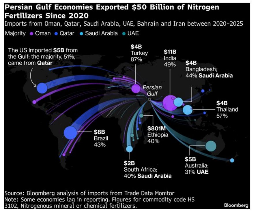 Khoảng 20% lượng LNG xuất khẩu toàn cầu đi qua eo biển Hormuz, chủ yếu từ Qatar. Do phụ thuộc lớn vào nguồn cung này để sản xuất phân bón, các quốc gia Nam Á trở thành khu vực dễ bị tổn thương nhất.