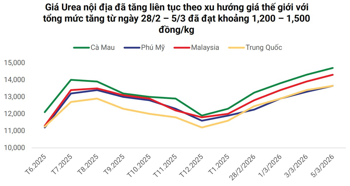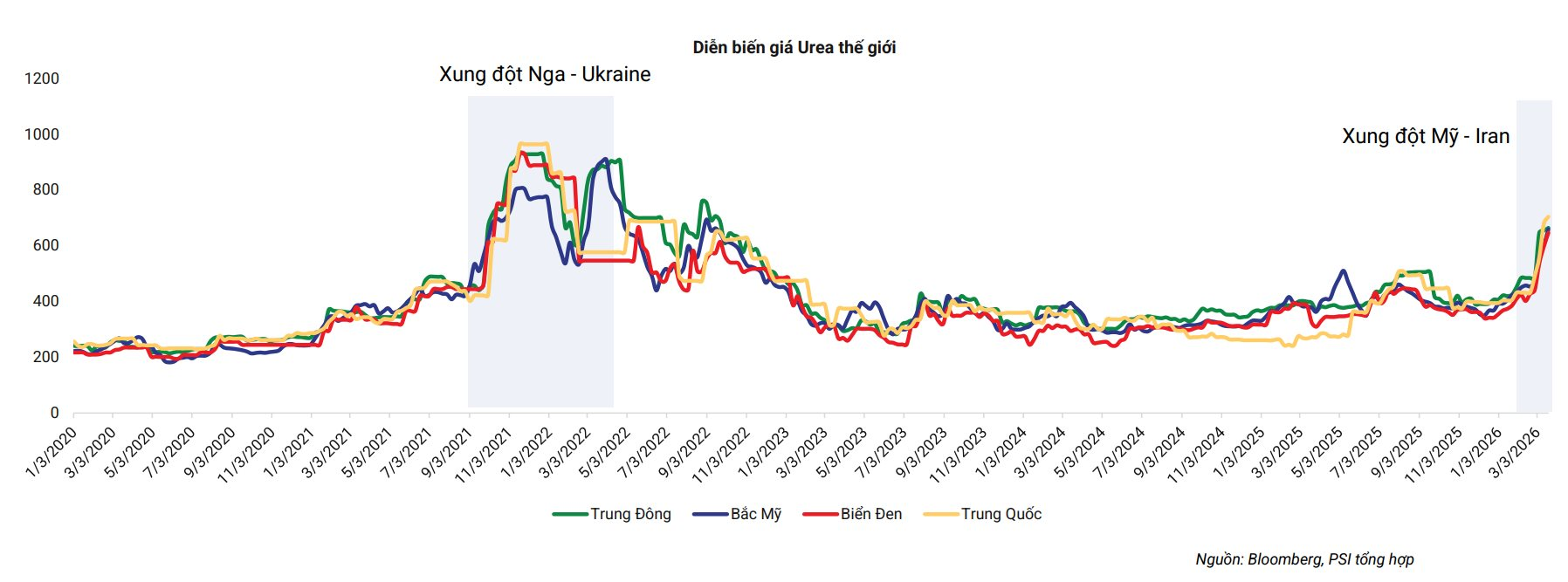 Giá Urea toàn cầu đã tăng mạnh liên tục kể từ khi xung đột tại Trung Đông leo thang vào ngày 28/02/2026, với mức tăng khoảng 42% tính đến hiện tại. Trong bối cảnh nhu cầu đạt đỉnh khi mùa gieo trồng tại Bắc bán cầu đến gần, kịch bản giá có thể tăng gấp đôi là khả thi, thậm chí quay lại vùng đỉnh lịch sử năm 2022 khi xảy ra xung đột Nga – Ukraine (Theo dự báo của Morningstar).