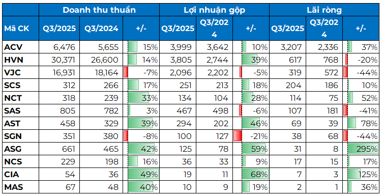 Một số doanh nghiệp khác trong ngành có kết quả kinh doanh bứt phá trong quý 3/2025. ASG đạt lợi nhuận gấp 4 lần cùng kỳ, lên 31 tỷ đồng, còn CIA ghi nhận lợi nhuận 7 tỷ đồng, tăng 125% so với cùng kỳ. CTCP Suất ăn Hàng không Nội Bài (NCS)  có kết quả tích cực với doanh thu 229 tỷ đồng (tăng 16%) và lợi nhuận 17 tỷ đồng (tăng 17%).
