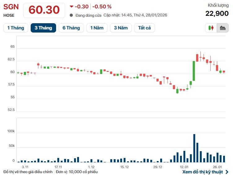 Kết thúc phiên giao dịch ngày 28/1, cổ phiếu SGN giảm còn 60.300 đồng/cp. Vốn hoá thị trường đạt hơn 2.000 tỷ đồng.