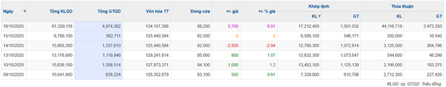 Phiên 16/10 cũng ghi nhận giá cổ phiếu MSN tăng trần lên 88,200 đồng/cp, thanh khoản đột biến lên hơn 61 triệu cp, tương đương giá trị giao dịch hơn 4,974 tỷ đồng.
