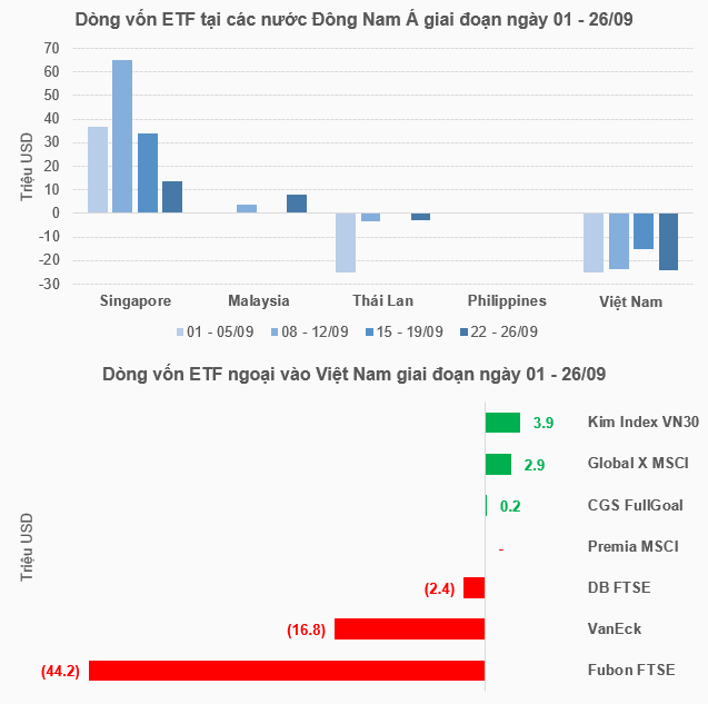 Xét trên dòng vốn ETF ngoại vào Việt Nam giai đoạn 4 tuần gần nhất (ngày 01 – 26/09), dễ thấy xu hướng rút ròng được duy trì xuyên suốt. Trong đó, lực bán chủ đạo đến từ Fubon FTSE và VanEck, lũy kế lần lượt 44.2 triệu USD và 16.8 triệu USD. Việt Nam cũng là quốc gia bị rút ròng nổi bật trong khu vực.