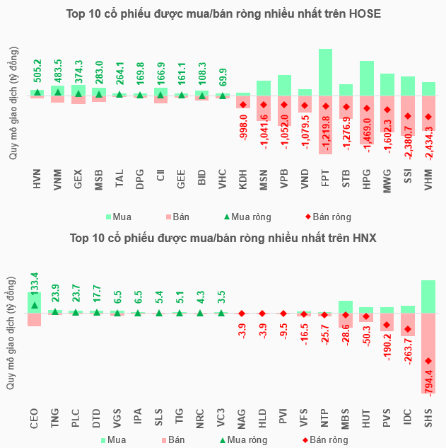 HOSE ghi nhận đến 9 trường hợp bị bán ròng hàng ngàn tỷ trong tháng 9, với hai vị trí dẫn đầu thuộc về VHM hơn 2.4 ngàn tỷ đồng và SSI gần 2.4 ngàn tỷ đồng. Ở chiều ngược lại, cổ phiếu được mua ròng mạnh nhất là HVN, tuy nhiên quy mô chỉ trên 505 tỷ đồng.