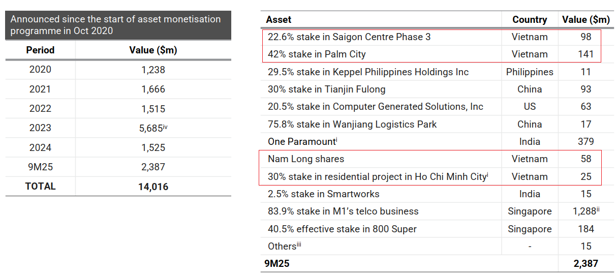Trong đó tại Việt Nam, Keppel đã thoái tổng cộng 322 triệu SGD (khoảng 247 triệu USD, tương đương 6,500 tỷ đồng), gồm 42% cổ phần tại Palm City (141 triệu SGD), 22.6% cổ phần tại Saigon Centre giai đoạn 3 (98 triệu SGD), cổ phiếu Nam Long mang về 58 triệu SGD và 30% cổ phần tại dự án nhà ở tại TPHCM giá trị 25 triệu SGD.