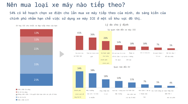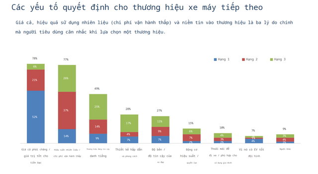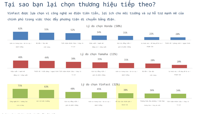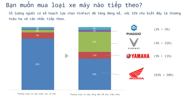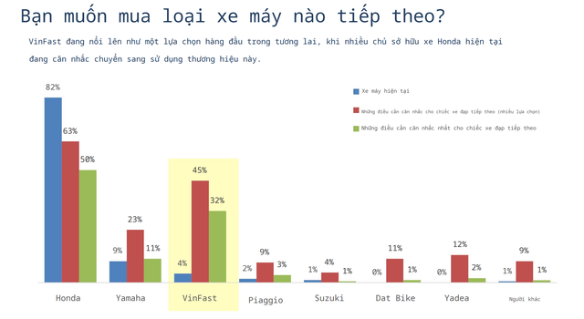 Một điểm sáng trong khảo sát là sự nổi lên của VinFast. Nếu như hiện nay, 82% người tham gia khảo sát đang đi Honda, 9% đi Yamaha và chỉ 4% đi VinFast, thì ở lựa chọn “xe tiếp theo”, 32% nói sẽ cân nhắc VinFast.