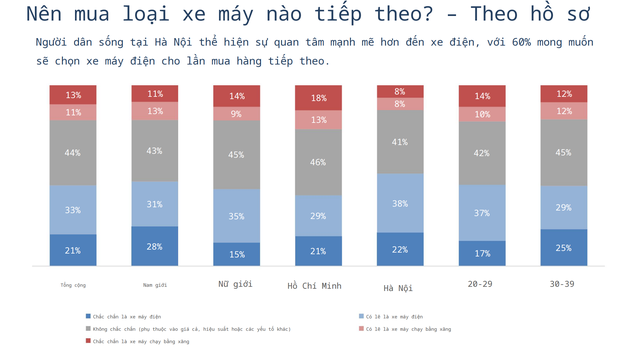 Điều đáng chú ý, người sống ở Hà Nội tỏ ra “sẵn sàng đi điện” hơn người TP.HCM: 60% cư dân thủ đô chọn EV so với 46% ở TP.HCM. Nhóm trẻ 20–29 tuổi cũng có tỷ lệ ủng hộ xe điện cao hơn nhóm lớn tuổi.