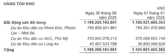 Trở lại với BCTC hợp nhất quý 3, tổng tài sản tại thời điểm 30/09/2025 của VRC ghi nhận hơn 1.7 ngàn tỷ đồng, đi ngang so với đầu năm. Khoản mục lớn nhất là hàng tồn kho cũng duy trì gần mức 1.2 ngàn tỷ đồng, toàn bộ đều là bất động sản dở dang.