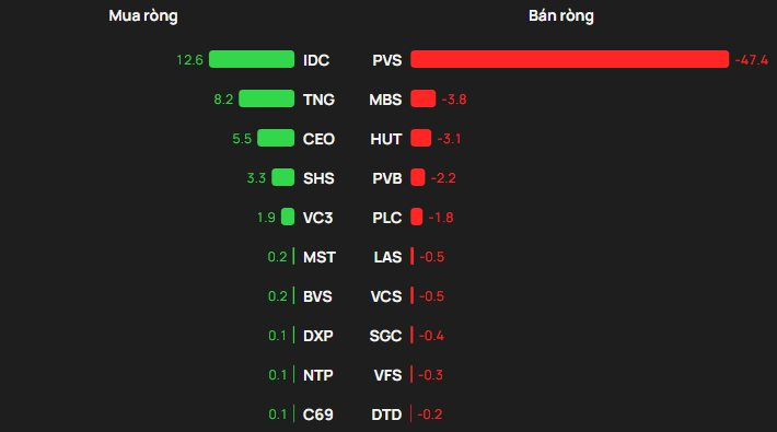 Ở chiều mua, khối ngoại mua ròng mạnh nhất tại IDC với giá trị khoảng 13 tỷ đồng. Xếp tiếp theo là TNG với 8 tỷ đồng và CEO với 6 tỷ đồng. Ngoài ra, SHS, VC3, MST, BVS,… cũng được mua ròng nhẹ vài trăm đến vài tỷ đồng.