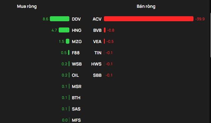 Ngược lại, cổ phiếu chịu áp lực bán ròng mạnh nhất trên UPCoM là ACV với giá trị khoảng 40 tỷ đồng. Xếp sau là BVB (-0,8 tỷ đồng), VEA (-0,5 tỷ đồng), TIN (-0,1 tỷ đồng), HWS (-0,1 tỷ đồng) và SBB (-0,1 tỷ đồng).
