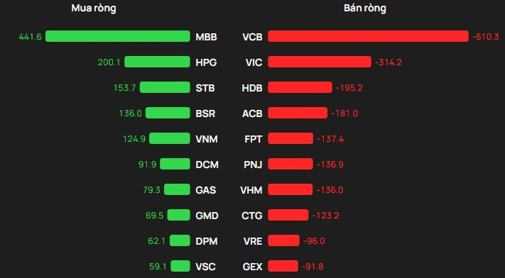Ở chiều mua, cổ phiếu MBB dẫn đầu với mức mua ròng khoảng 442 tỷ đồng, theo sau là HPG (200 tỷ) và STB (154 tỷ). Hai mã BSR (136 tỷ) và VNM (125 tỷ) cũng nằm trong nhóm được khối ngoại gom ròng mạnh.