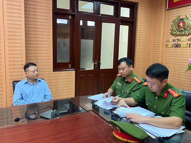 Shark Bình tại cơ quan Công an. Ảnh: Công an Hà Nội.
