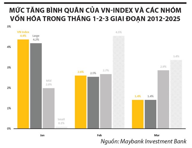 Trong khi đó, nhóm cổ phiếu vốn hóa nhỏ thường đi ngang trong tháng 1, sau đó tăng tốc trong hai tháng tiếp theo. Mẫu hình diễn biến tương đồng với nhóm vốn hóa vừa nhưng đi kèm biên độ dao động lớn hơn, phản ánh mức độ rủi ro và tính đầu cơ cao hơn.