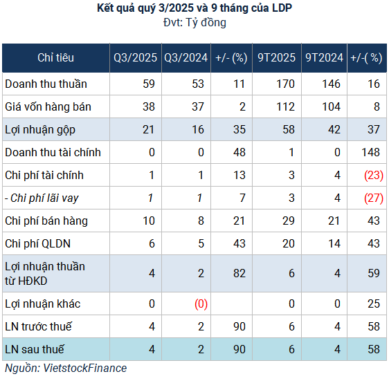 Lũy kế 9 tháng đầu năm 2025, LDP lãi ròng 6 tỷ đồng, tăng 58% so với cùng kỳ, thực hiện được 85% kế hoạch năm, nhờ doanh thu thuần tăng 16% và doanh thu tài chính gấp 2.5 lần cùng kỳ.