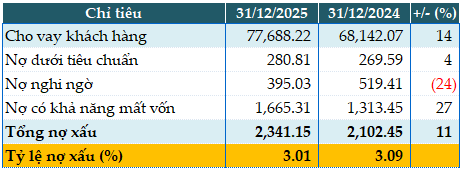 Tổng nợ xấu tính đến 31/12/2025 của BVBank tăng 11% so với đầu năm, lên 2,341 tỷ đồng. Tỷ lệ nợ xấu/dư nợ giảm từ mức 3.09% đầu năm xuống còn 3.01%.