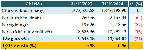 Chất lượng nợ vay của VCB tính đến 31/12/2025. Đvt: Tỷ đồng