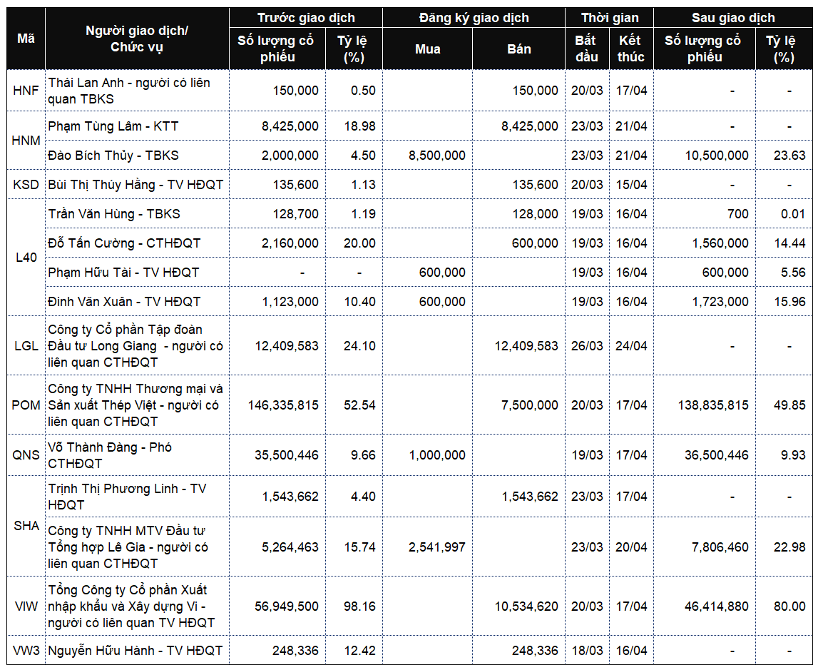 Danh sách lãnh đạo công ty và người thân giao dịch từ ngày 16-20/3/2026