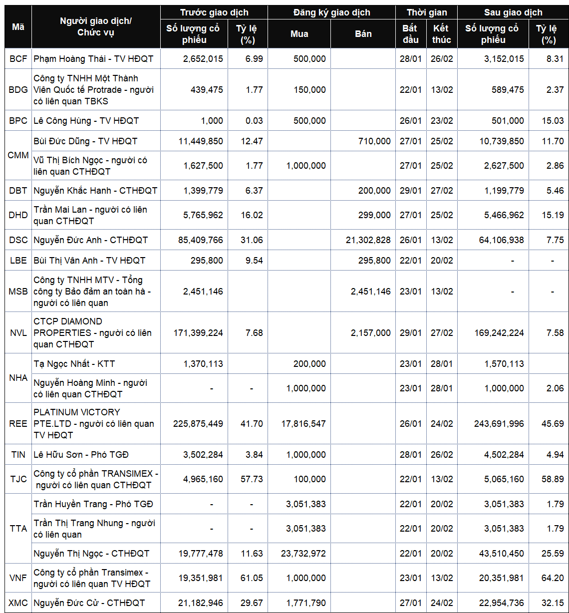 Danh sách lãnh đạo công ty và người thân giao dịch từ ngày 19-23/1/2026