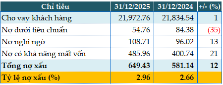 Tổng nợ xấu tính đến 31/12/2025 chiếm hơn 649 tỷ đồng trong tổng dư nợ, tăng 12% so với đầu năm. Tỷ lệ nợ xấu/dư nợ tăng từ mức 2.66% đầu năm lên 2.96%. Tỷ lệ nợ xấu theo Thông tư 31/2024/TT-NHNN là 2.27%.