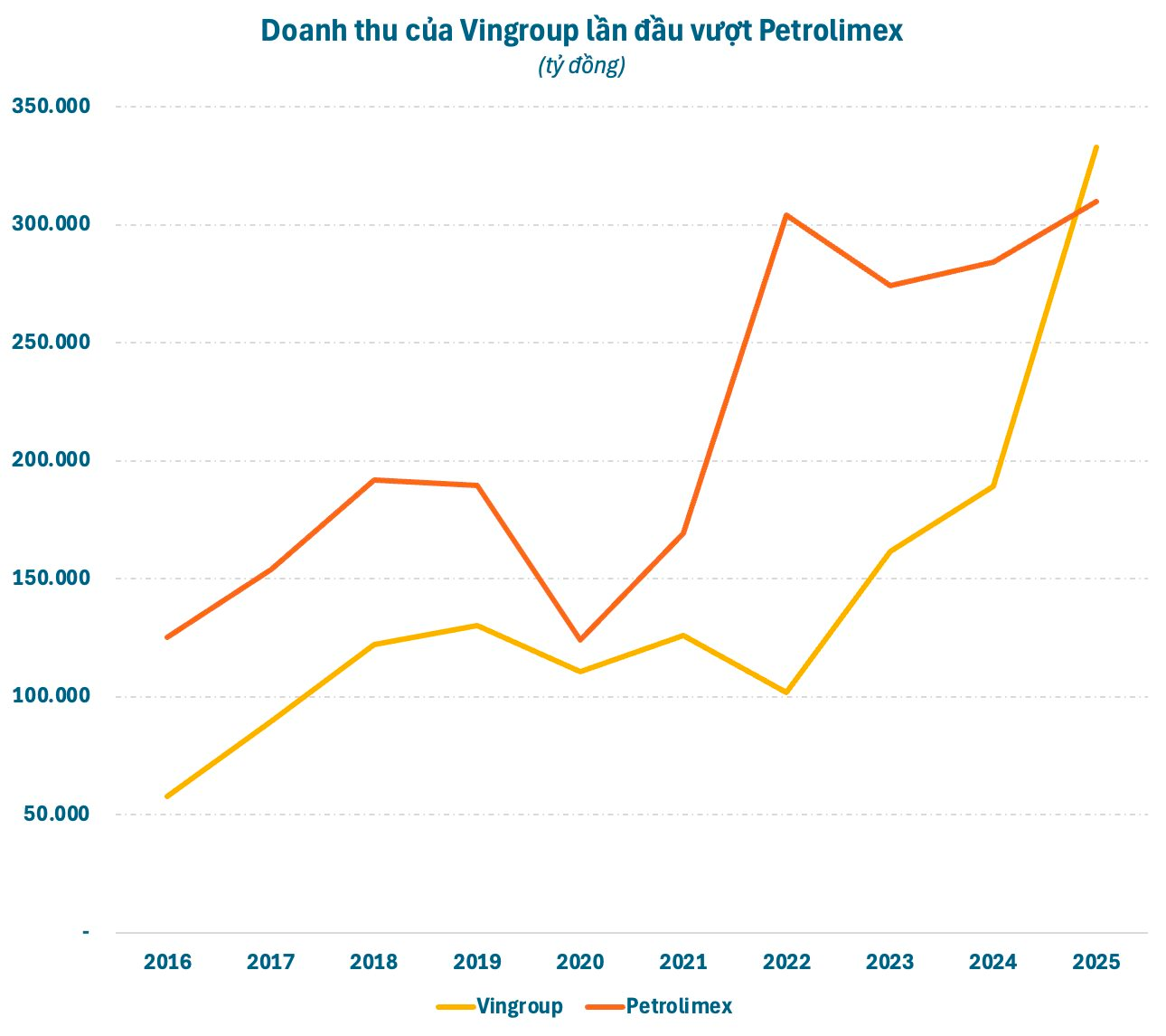 Cú bứt phá ngoạn mục đưa Vingroup soán ngôi Petrolimex (PLX) trở thành quán quân doanh thu năm 2025. Đây là lần đầu tiên “đại gia” bán lẻ xăng dầu lớn nhất cả nước đánh mất vị trí này dù doanh thu cũng đạt kỷ lục. Năm 2025, doanh thu của Petrolimex tăng gần 9% so với cùng kỳ, đạt gần 310.000 tỷ đồng, tương ứng bình quân mỗi phút, kiếm hơn 590 triệu đồng.