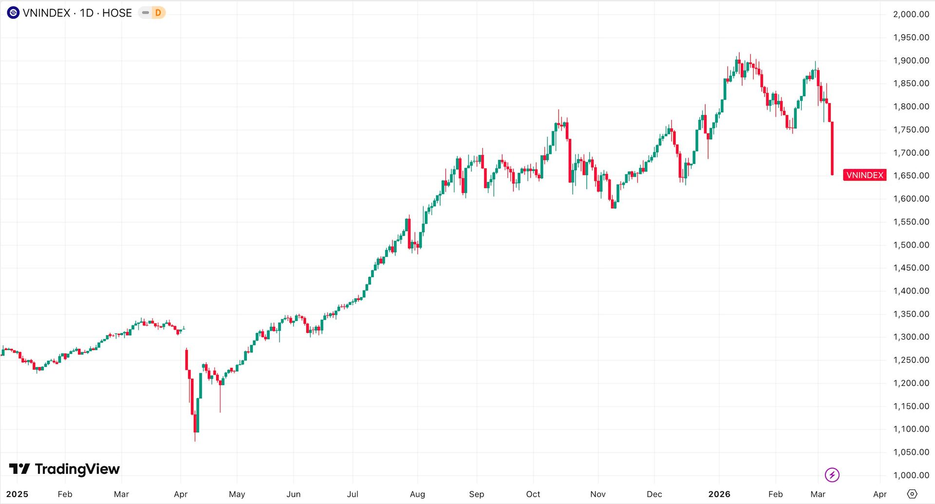 Thị trường chứng khoán Việt Nam vừa trải qua phiên bán tháo lịch sử khi VN-Index mất 115 điểm (-6,51%) với hàng trăm cổ phiếu sàn “trắng bên mua”. Tính từ khi liên quân Mỹ/Israel bắt đầu tấn công Iran (cuối tháng 2), VN-Index đã đánh rơi gần 230 điểm. Ngay sau nhịp rơi sâu, nhiều tổ chức đã đưa ra nhận định về tình hình thị trường và dự báo xu hướng sắp tới.