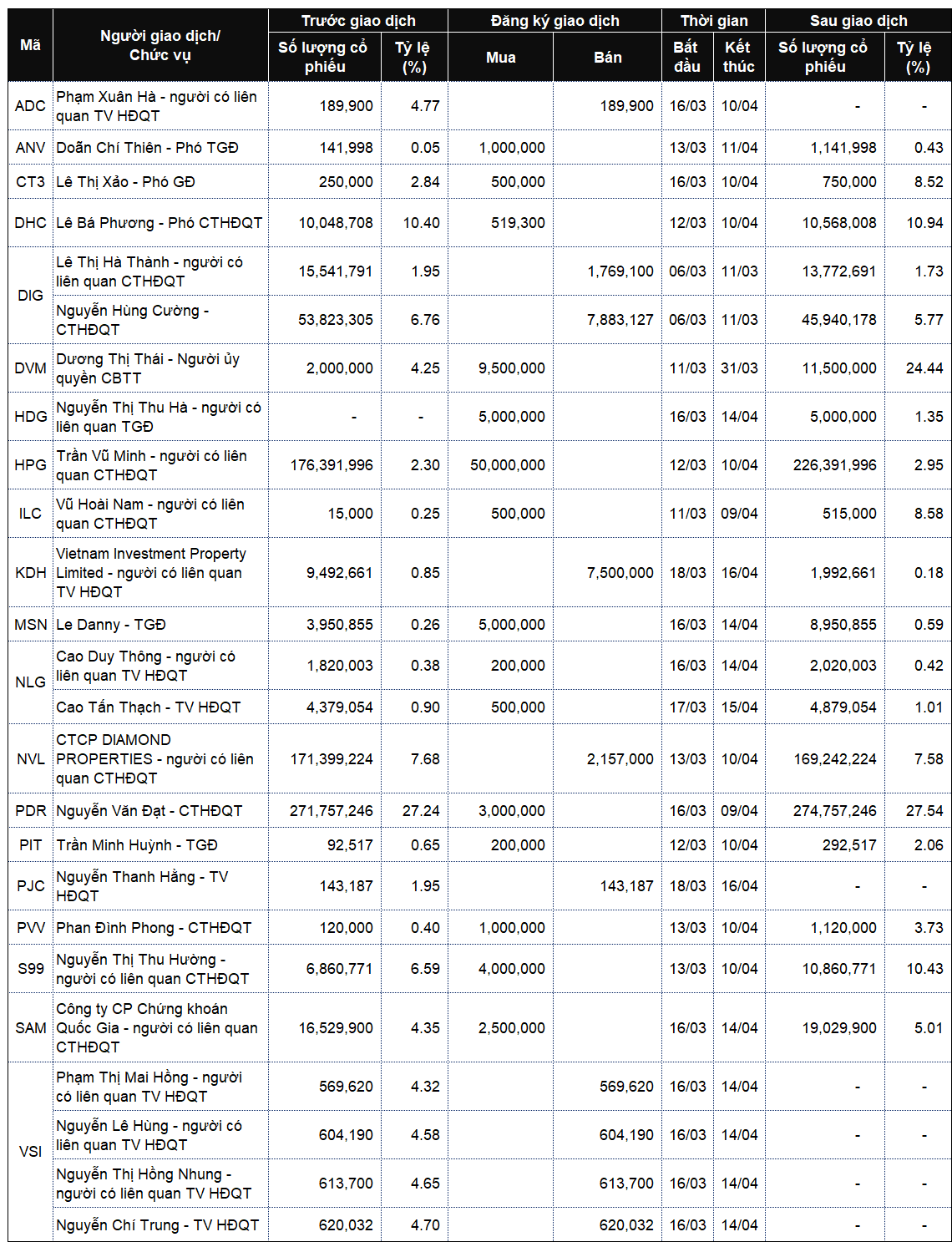 Danh sách lãnh đạo công ty và người thân giao dịch từ ngày 9-13/3/2026