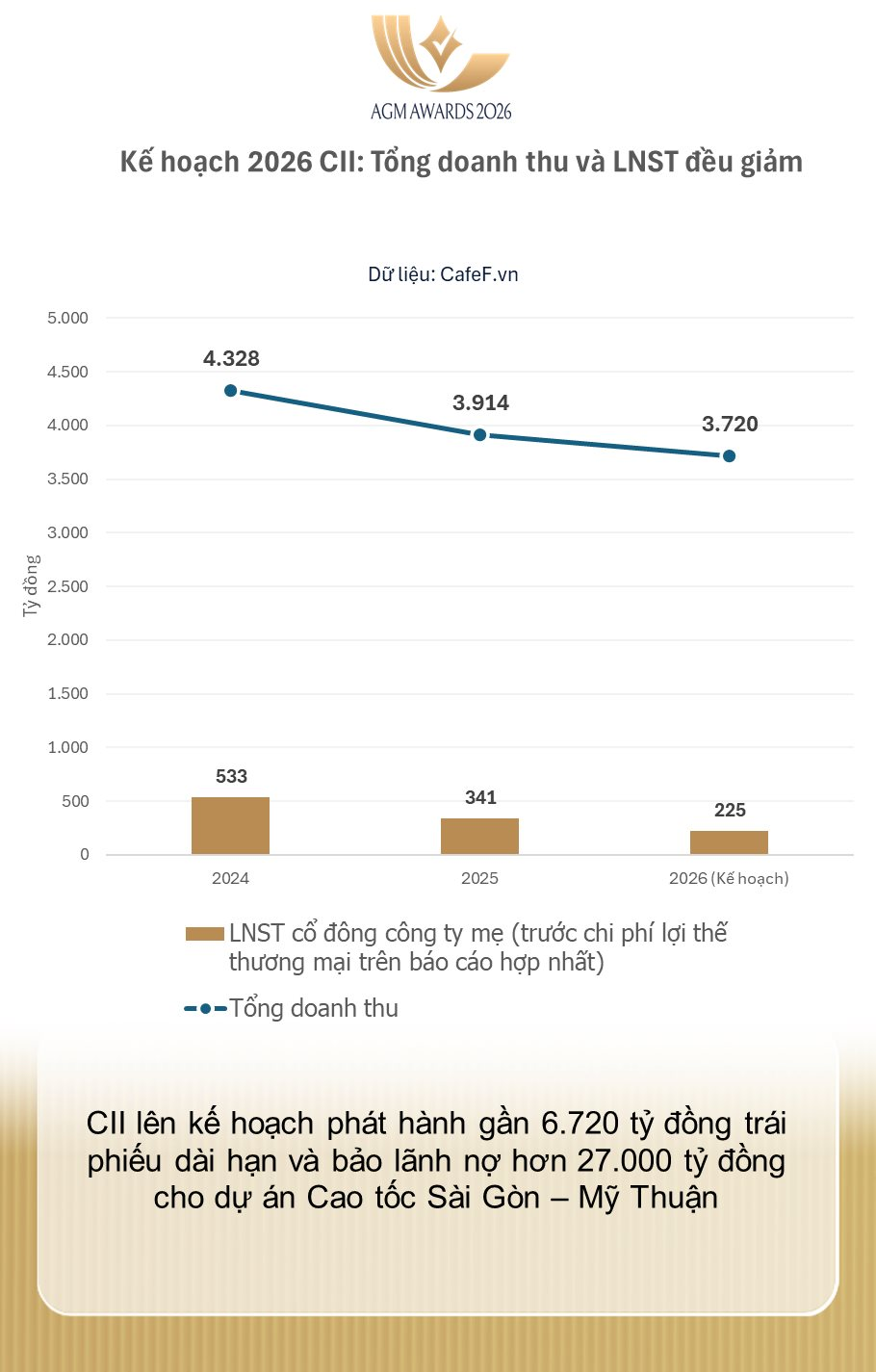 Bước sang năm 2026, CII đặt mục tiêu tổng doanh thu đạt 3.720 tỷ đồng, giảm gần 5% so với năm 2025 . Chỉ tiêu kế hoạch lợi nhuận sau thuế của cổ đông công ty mẹ 225 tỷ đồng, giảm 34% tính trên cùng hệ quy chiếu đã loại trừ chi phí lợi thế thương mại.