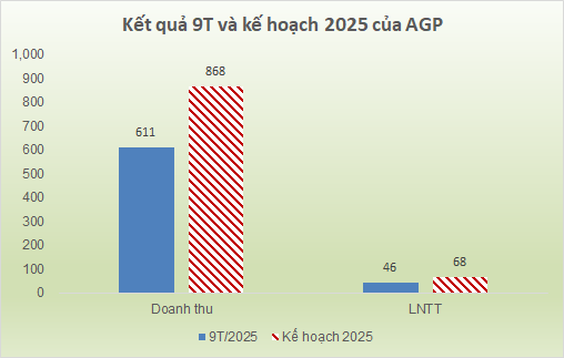 Lũy kế 9 tháng đầu năm, Doanh nghiệp đạt 611 tỷ đồng doanh thu thuần và 37 tỷ đồng lãi sau thuế, tăng lần lượt 7% và 8% so với cùng kỳ. So với kế hoạch thông qua từ ĐHĐCĐ 2025, AGP thực hiện được hơn 70% mục tiêu doanh thu và gần 68% mục tiêu lãi trước thuế cả năm.