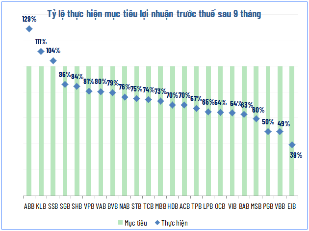 Bên cạnh kết quả tích cực, một số ngân hàng đã sớm vượt kế hoạch lợi nhuận cả năm. ABB – nhà băng có mức tăng trưởng mạnh nhất – hiện đã vượt 29% kế hoạch năm chỉ sau 9 tháng. KLBSSB cũng vượt kế hoạch lần lượt 11% và 4%, trong khi phần lớn các ngân hàng khác đã hoàn thành trên 60% mục tiêu.