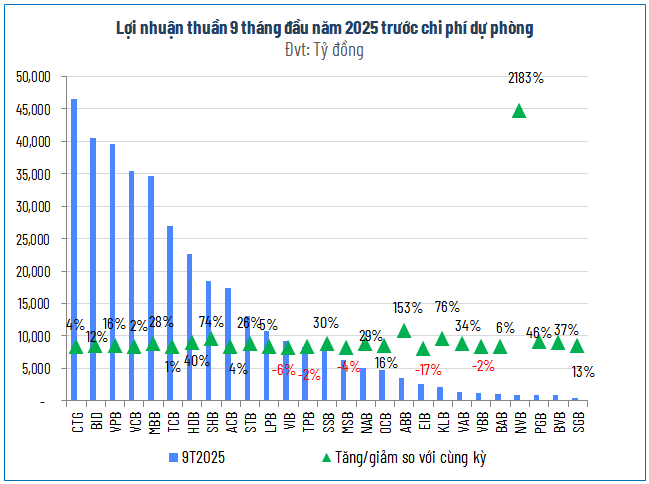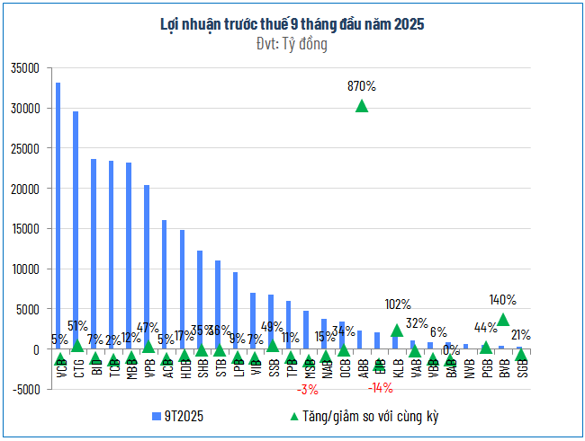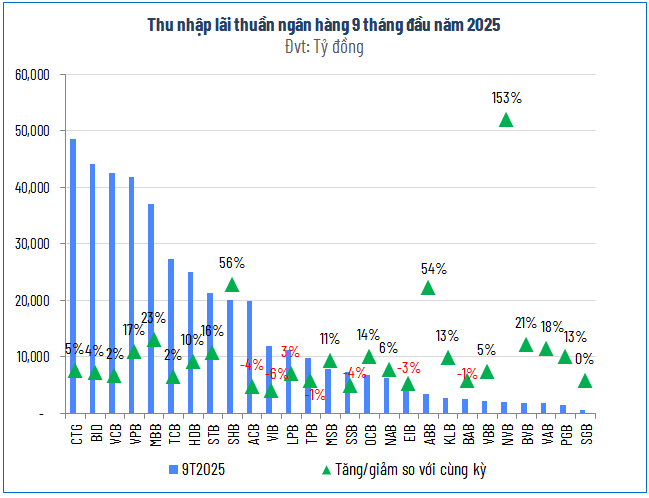 Sau 9 tháng đầu năm 2025, hầu hết các nhà băng đều báo lãi tăng mạnh, thậm chí vượt xa kế hoạch, bất chấp áp lực biên lãi ròng co hẹp khi mặt bằng lãi suất vẫn ở mức thấp.